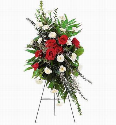 Flower Stand of Carnations and Roses with large leaves and fillers (Substitutions may apply if a flower item is unavailable)